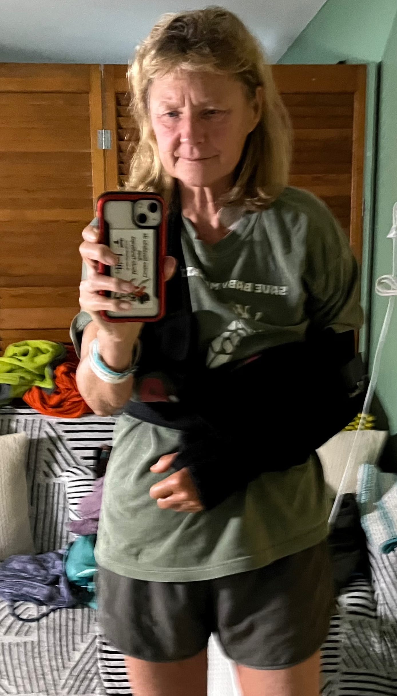 After the second week I was allowed to take off the sling. My arm was so happy, but she couldn’t do much. Rita had given me a set of PT exercises, including the fist pumping, rotating palm, moving hand up and down, and letting arm hang and go in circles. Those I could do. There was also crawling hand up a wall and lifting a stick perpendicular to my body assisted by my other hand. Those were impossible due to pain.