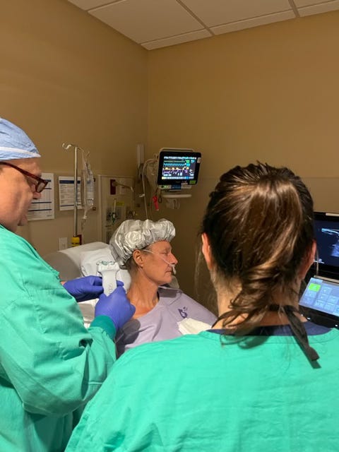 The anesthesiologist, a bear of a guy, had a cold and was not wearing a mask (photo below), but after he delivered 2 units of Versed and another unit of something else via an IV, I didn’t care. Oh goodie, he’s injecting nerve block into my brachial plexus and is using ultrasound to hit his marks. Cooooool.